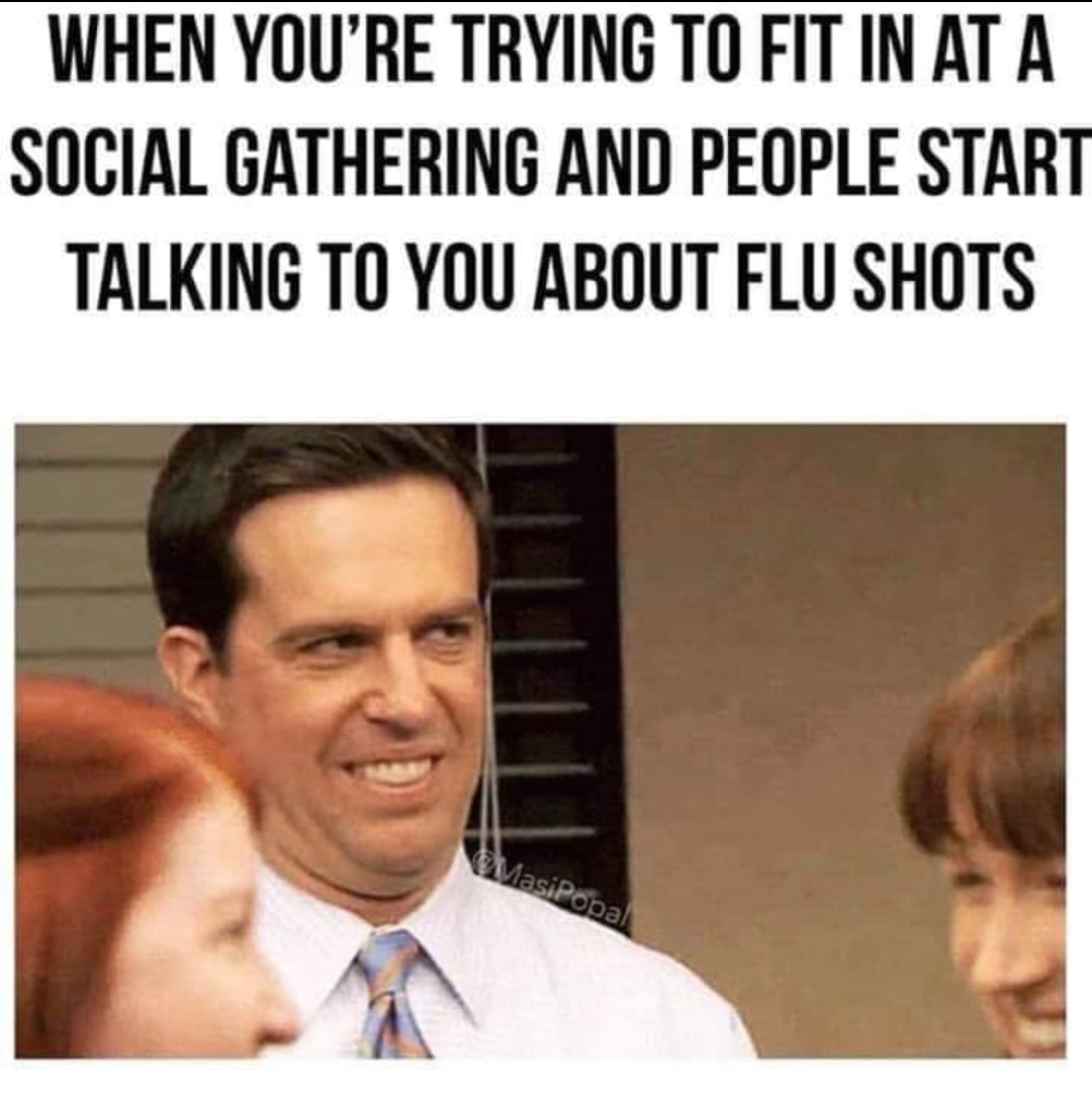 Memes Trying to fit in at a party and they bring up flu shots Paleo Family February 13, 2019 0 Share this: Share on Facebook (Opens in new window) Facebook Share on X (Opens in new window) X Share on Pinterest (Opens in new window) Pinterest Share on LinkedIn (Opens in new window) LinkedIn Related Tags: awkward, flu shot, vaccination, vaccine Continue Reading Previous It’s amazing what a nice smile will doNext Vaccines Are Safe Because the FDA Has Approved Them More Stories Memes Three Sisters Paleo Family September 19, 2022 0 Memes Science Always Trust the Science Paleo Family September 2, 2022 0 Memes ‘I wish I could scrub the spike protein out of my system as easily as the CDC scrubs their website’ Paleo Family August 29, 2022 0