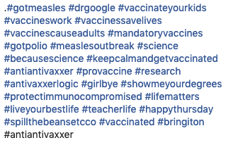 All the hashtags from a popular provaxxer page were highlighted and linked except for “#antivaxxer”.