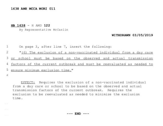 Representative McCaslin, understanding the risks associated with some vaccines, submitted an amendment to the bill requiring children who had been vaccinated with live virus vaccines to stay out of daycare or school to avoid shedding in accordance with the vaccine insert: