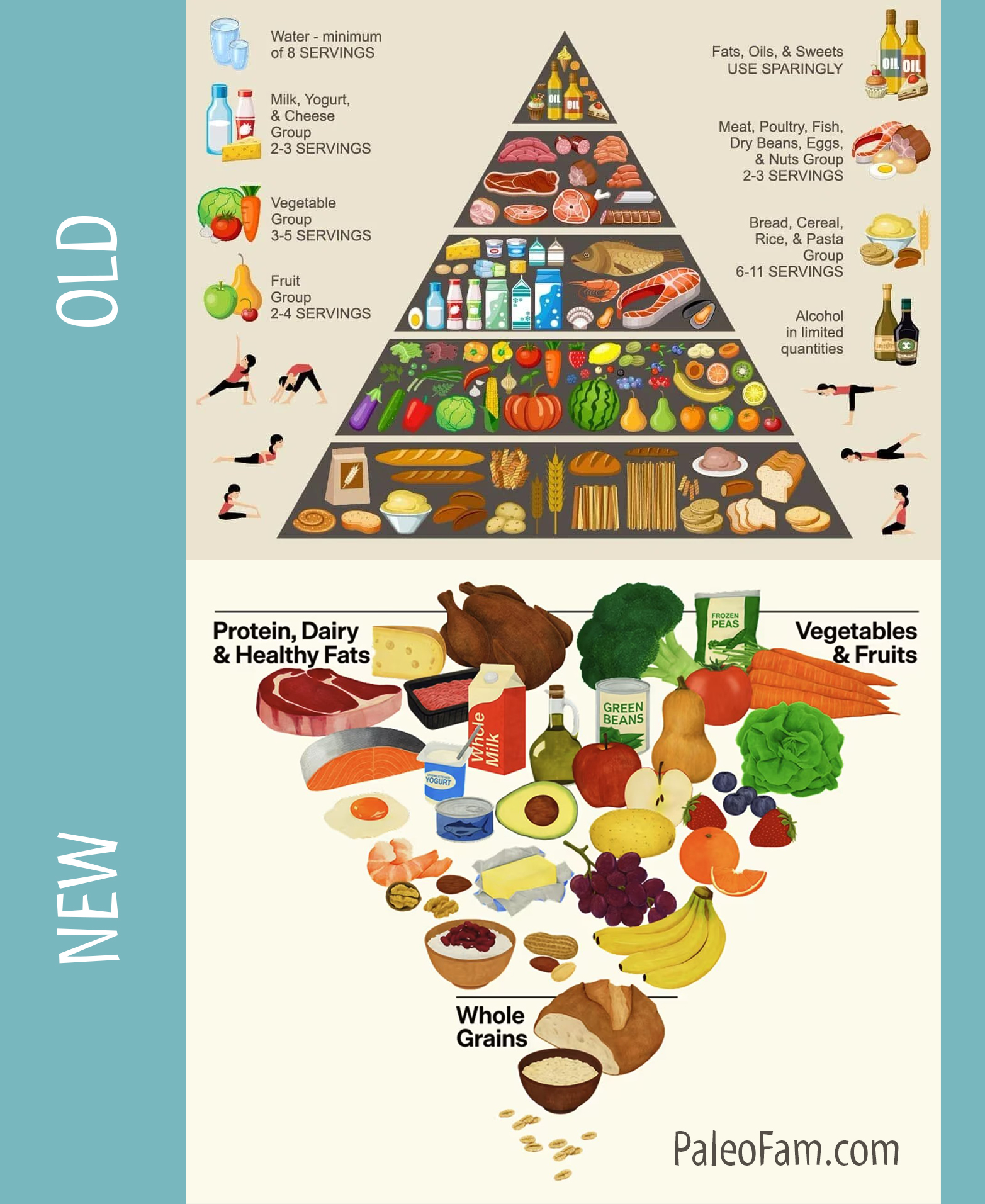 - Recommending abundant fruits and vegetables (at least five servings per day) and whole grains, but in smaller proportions relative to proteins and fats.